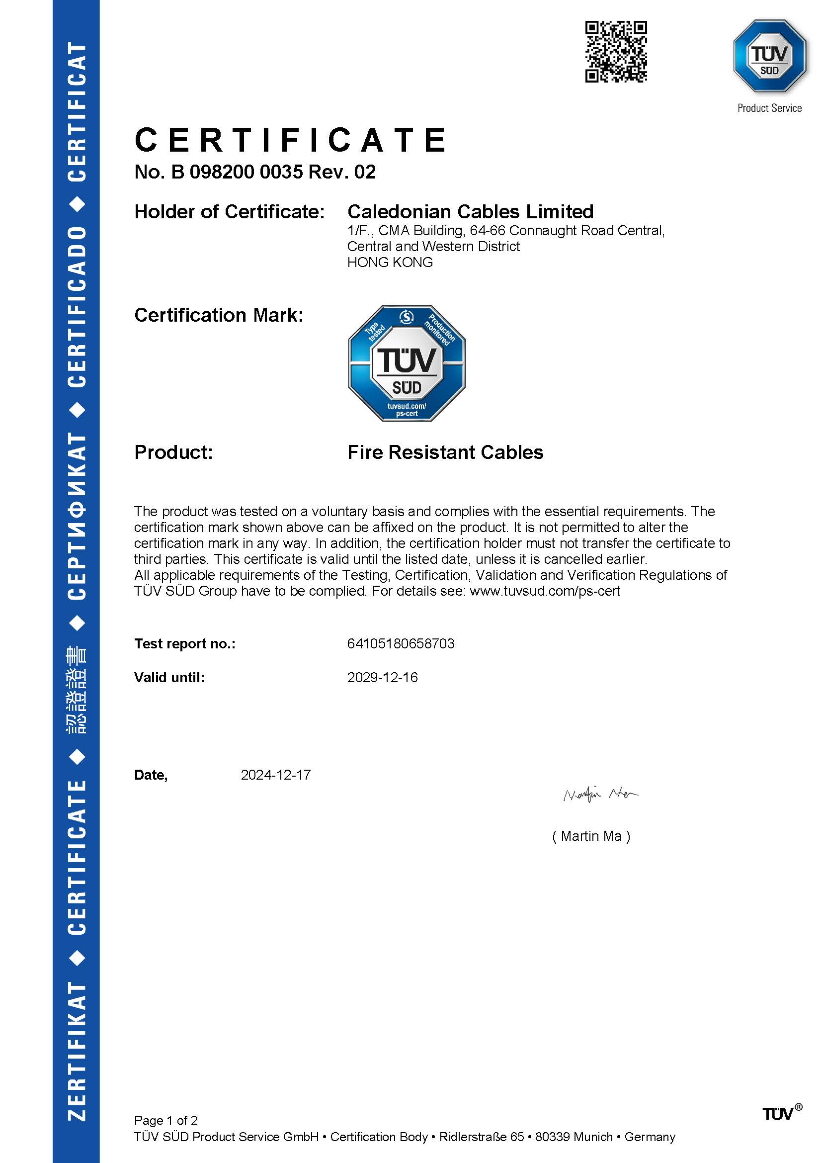 Certificate Number : B 098200 0035 Rev. 02