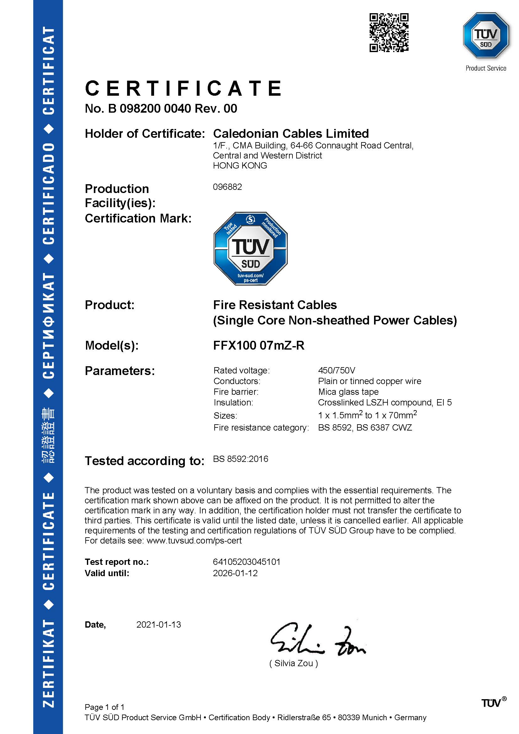 Certificate Number : B 098200 0040 Rev. 00