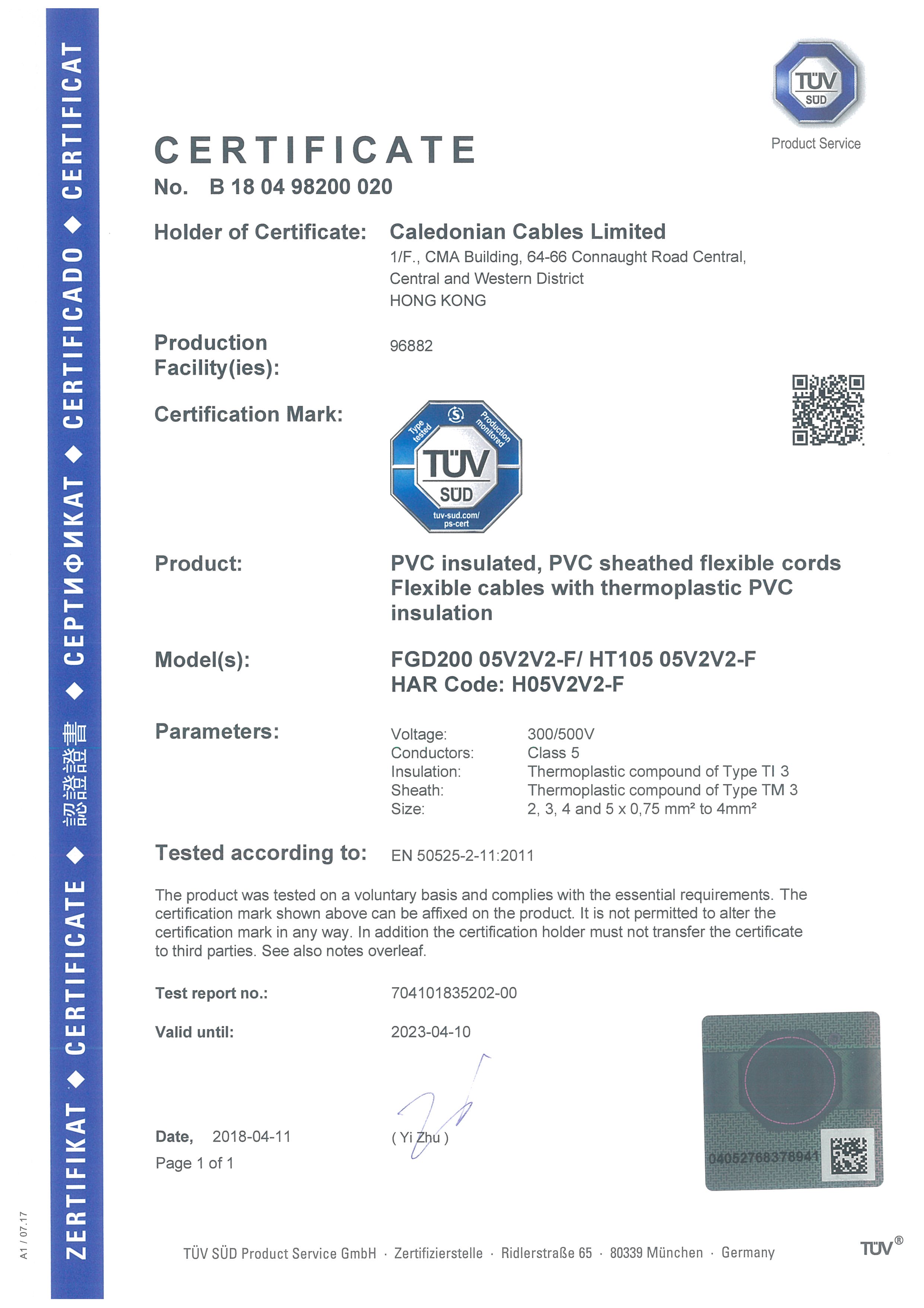 TUV MARK-EN 50525-2-11 H05V2V2-F Certification