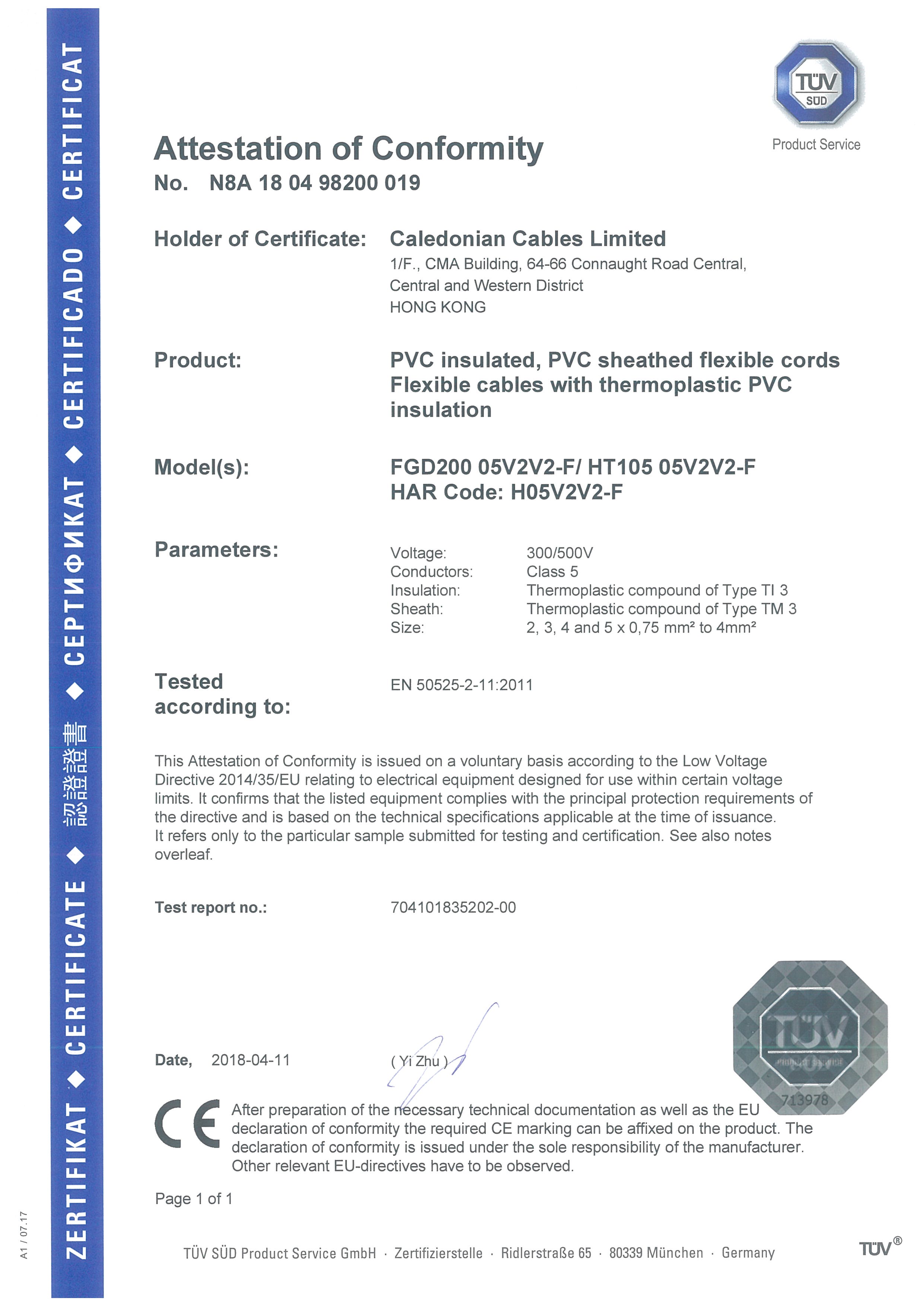 CE-EN 50525-2-11 H05V2V2-F Certification