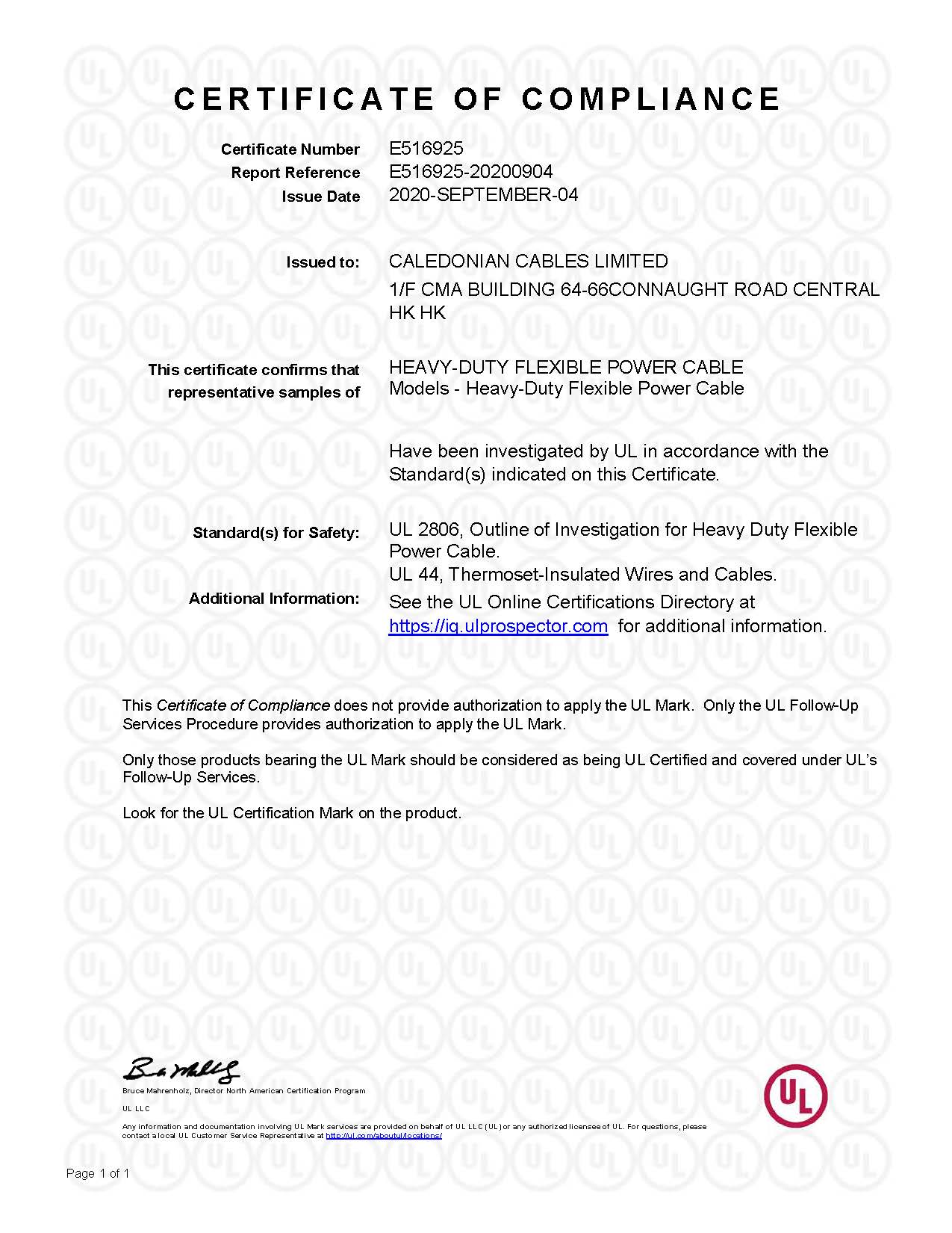 Certificate Number : E516925