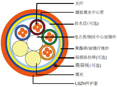 该电缆是由5-36根包含有导管和填充物的光纤组成,同时这些导管和填充物在中心加强件周围绞合达到3层以及被捆绑在低烟无卤护套下面。 |