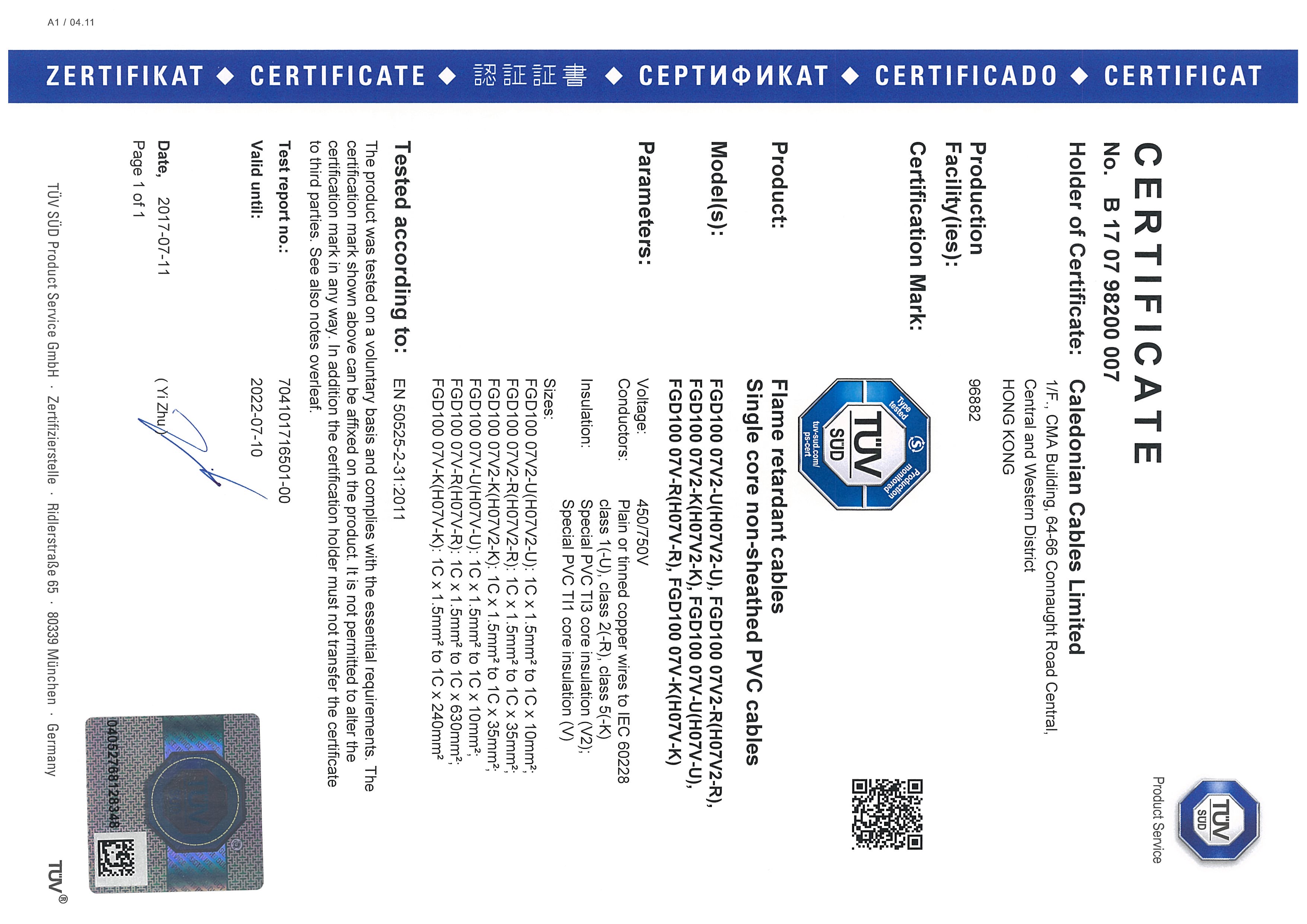 Certificate Number : B 17 07 98200 007