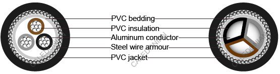 | Filler(optional) Binder Tape(optional) Inner Sheath/ Bedding Armour Outer Sheath | PVC or Polypropylene yarn Polyester (Mylar) tape PVC (Polyvinyl Chloride) Single Core: AWA (Aluminum WireArmour) Multi Core: SWA (Steel Wire or Tape Armour) PVC(Polyvinyl Chloride), type TM1 | |