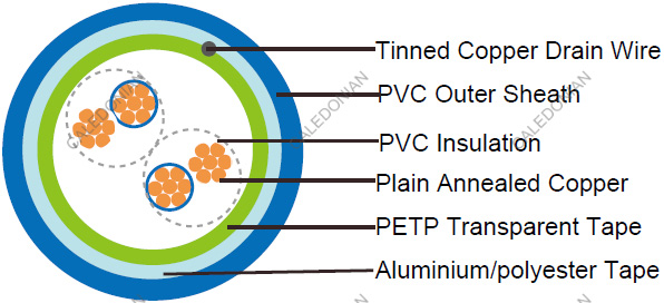 - Overall Screen: Aluminium/polyester tape is applied over the laid up pairs metallic side down in contact with tinned copper drain wire, 0.5mm2