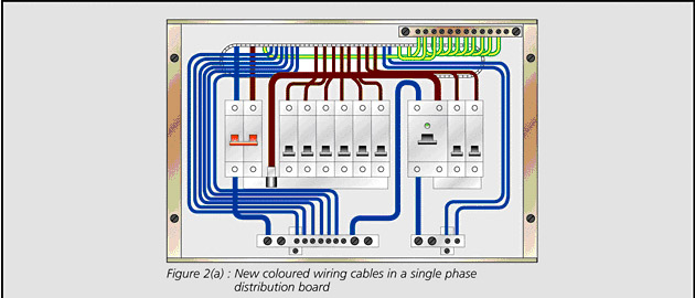 The old cable colour code, i.e. red, yellow and blue for phase conductors and black for the neutral conductor, are to be replaced by the new one, i.e. brown, black and grey for phase conductors and blue for the neutral conductor, as specified in Table 1. Circuits for new installations should be wired in new colour coded cables.