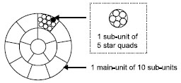 The quads of a sub-unit are to be counted according to the sequence of basic colours. In cables with more than 5 star quads, the sub- and main-units must be counted continuously beginning with maker-unit at inner layer towards outside.