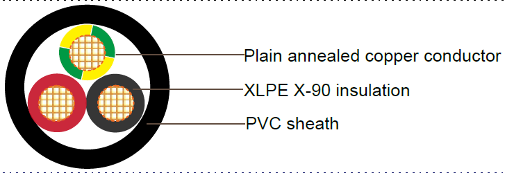 XLPE Insulated, PVC Sheathed 2 core+E Unarmored Cables, 0.6/1kV