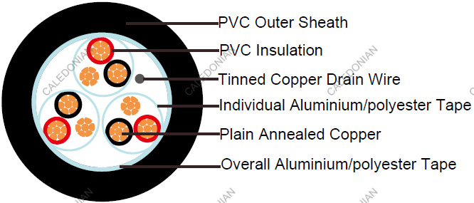 - Individual Screen: Aluminium/polyester tape is applied over each pair metallic side down in contact with tinned copper drain wire, 0.5mm2