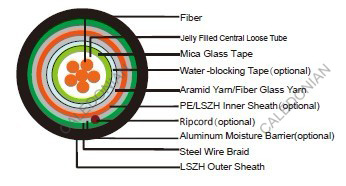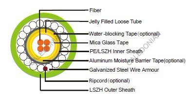 Fire barrier: The jelly filled tube with up to 24 fibers is wrapped with a fire blocking mica glass tapes.