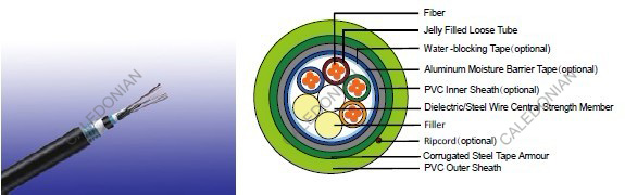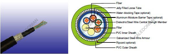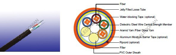 Fibers: Singlemode and multimode fibers, with loose tube technology.Structure: The cable consists of 5 to 36 fibers containing tubes or fillers stranded in up to 3 layers around a central strength member and bound under a PVC sheath. Each tube contains 4 -12 fibers, which is filled with water blocking gel.