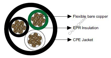| Jacket | Heavy-duty Chlorinated Polyethylene (CPE), black. (Cables having a nominal outside diameter of more than 2.0 inches require extra-heavy-duty jackets.) |