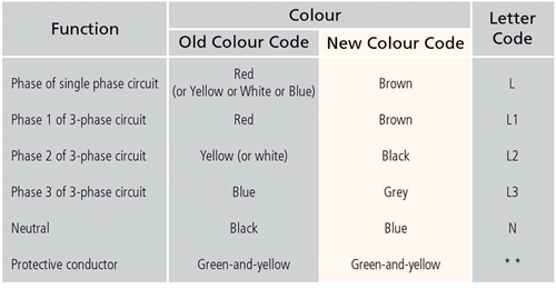 The old cable colour code, i.e. red, yellow and blue for phase conductors and black for the neutral conductor, are to be replaced by the new one, i.e. brown, black and grey for phase conductors and blue for the neutral conductor, as specified in Table 1. Circuits for new installations should be wired in new colour coded cables.