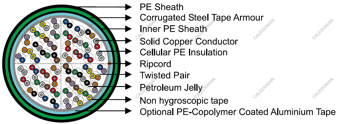 Cables with up to 100 pairs are composed of 25-pair units or 12/13-pair units; cables with over 100 pairs are composed of 25, 50 or 100-pair units cabled together. Any extra pairs form a separate unit. Units are identified by colour coded binders. Standard construction is per CW 1236 given in Cable Make Up Diagram