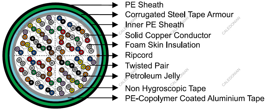 Cables of 25 pairs or less are assembled into cylindrical core. Cables larger than 25 pairs are assembled into units, which are then used to form the core Units are identified by colour coded binders. Standard construction is per RUS(REA) PE-89 given in Cable Make Up Diagram