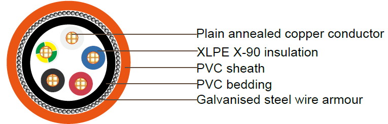 XLPE Insulated, PVC Sheathed 4 core+E Armored Cables 0.6/1kV