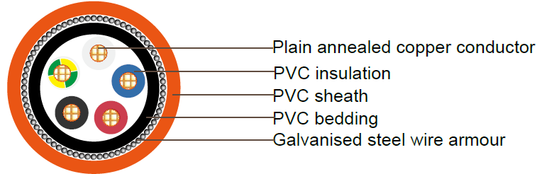 PVC Insulated, PVC Sheathed 4 core+E Armored Cables, 0.6/1kV