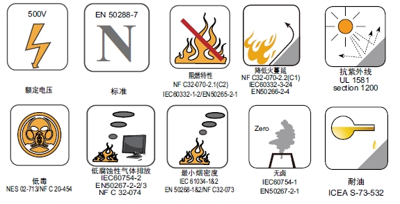 | 阻燃特性(单根电缆垂直燃烧测试) | EN 60332-1-2; IEC 60332-1-2; BS EN 60332-1-2; VDE 0482-332-1; NBN C 30-004 (cat. F1); NF C32-070-2.1(C2); CEI 20-35/1-2; EN 50265-2-1*; DIN VDE 0482-265-2-1* |