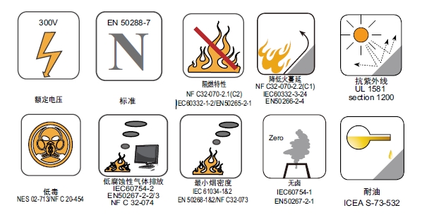 | 阻燃特性(单根电缆垂直燃烧测试) | EN 60332-1-2; IEC 60332-1-2; BS EN 60332-1-2; VDE 0482-332-1; NBN C 30-004 (cat. F1); NF C32-070-2.1(C2); CEI 20-35/1-2; EN 50265-2-1*; DIN VDE 0482-265-2-1* |