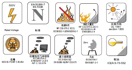 | 阻燃特性(单根电缆垂直燃烧测试) | EN 60332-1-2; IEC 60332-1-2; BS EN 60332-1-2; VDE 0482-332-1; NBN C 30-004 (cat. F1); NF C32-070-2.1(C2); CEI 20-35/1-2; EN 50265-2-1*; DIN VDE 0482-265-2-1* |