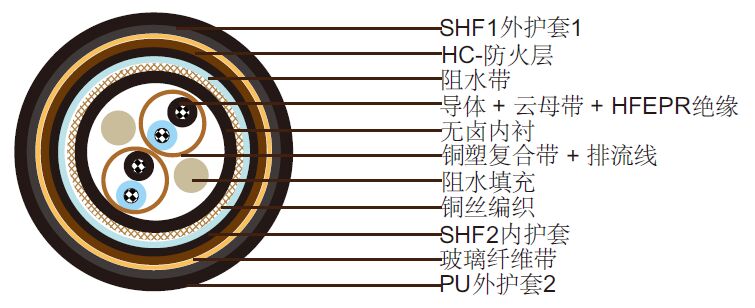 外护套 1: 阻燃无卤热塑材料SHF1, 灰色(本安电缆为蓝色).