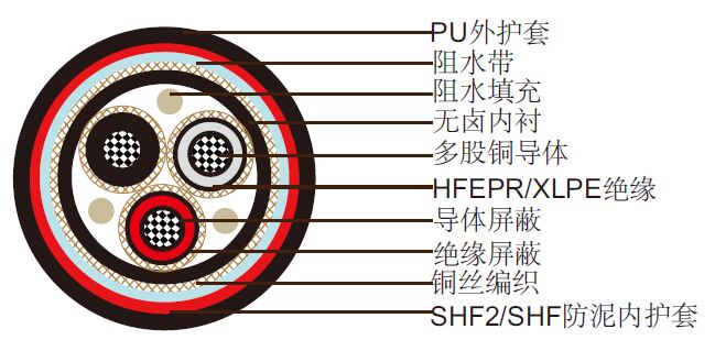 绝缘: 无卤EPR。XLPE可选(用于TFOU电缆).