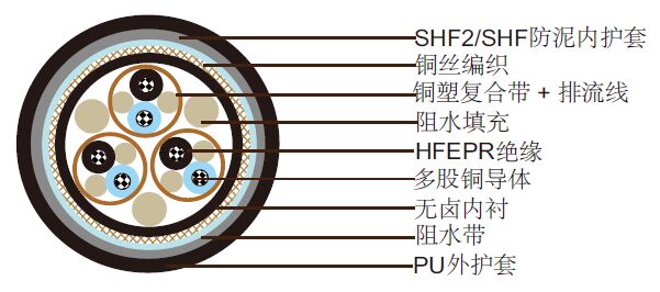 内护套: 无卤热固性化合物, SHF2(用于S1型)或无卤防泥浆热固材料 SHF防泥(用于S1/S5型