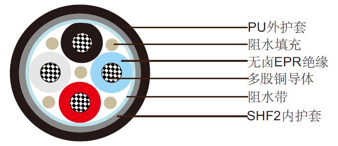 导体: IEC 60228 2类多股镀锡退火铜导体.绝缘: 无卤EPR.