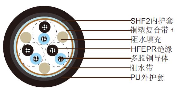 总屏蔽: 对/三线组绞合为缆心,外层为铜塑复合带总屏蔽和多股镀锡铜排流线。对/三线组通过编号磁带或直接在绝缘线上印刷数字来进行编号.