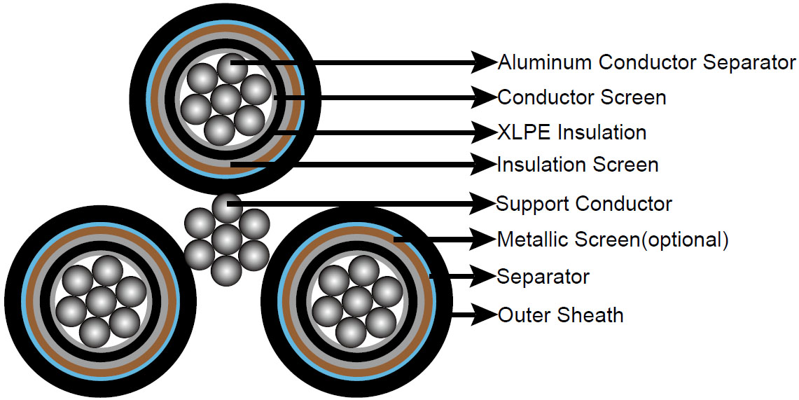 三个XLPE绝缘屏蔽线芯包绕在镀锌钢丝右侧敷设。 |
