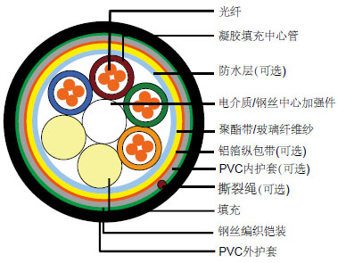 将芳纶纱或者玻璃纤维缠绕在束管周围用以对电缆提供物理保护和拉伸强度,同时对该电缆增加防火保护。 |