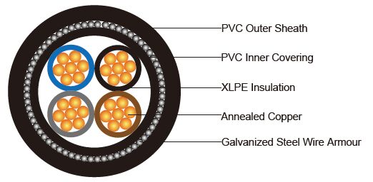 600/1000V IEC 60502标准XLPE绝缘PVC护套铠装电力电缆 (2-4芯) 主要应用于发电站、公共交通客运系统、机场、石化工厂、酒店、医院、高层建筑等的配线电